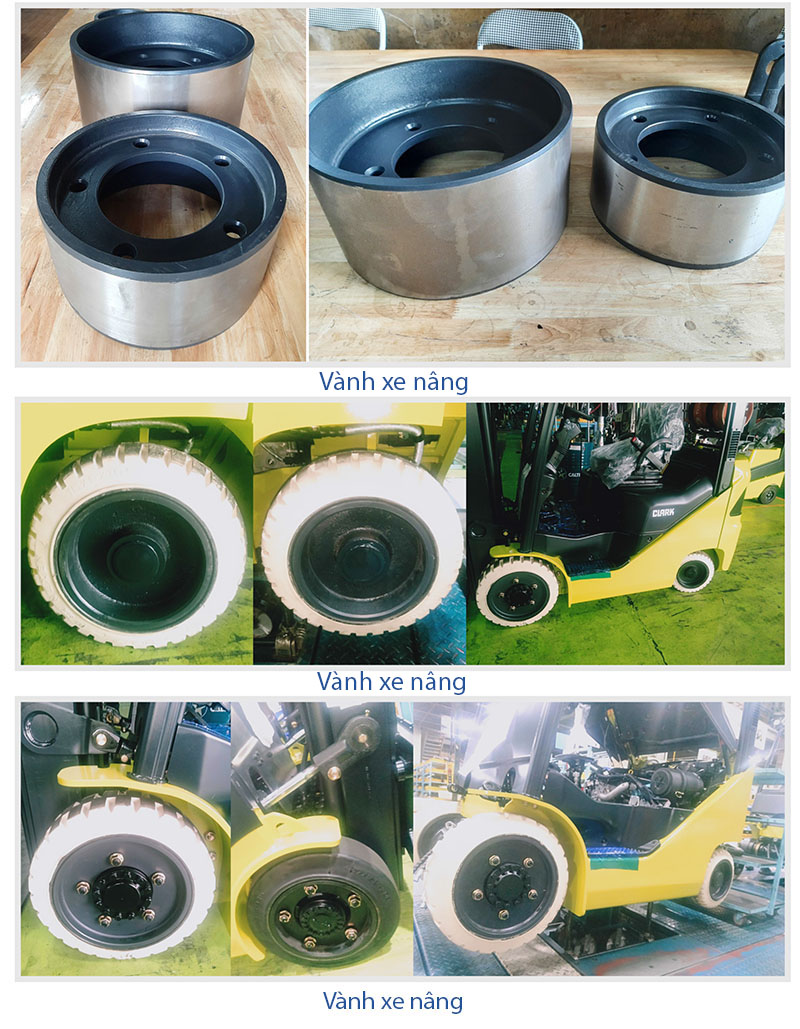 Ngành xe nâng sử dụng nhiều sản phẩm cơ khí chính xác, đóng vai trò quan trọng trong việc đảm bảo hiệu suất nâng hạ, vận chuyển và an toàn vận hành. Các sản phẩm cơ khí tiêu biểu bao gồm: Càng nâng (fork): là bộ phận trực tiếp nâng và đỡ hàng hóa. Trụ nâng (mast): hệ thống cơ cấu nâng gồm puly, xích và xy lanh thủy lực. Khung xe, giá đỡ: làm từ thép kết cấu chịu lực cao, đảm bảo độ bền và ổn định. Bánh răng, trục truyền, bạc đạn: tham gia vào hệ thống truyền động cơ khí giữa động cơ, hộp số và bánh xe. Cụm cơ cấu lái (steering knuckle, thanh kéo, trụ xoay): giúp điều hướng chính xác và an toàn. Xi lanh thủy lực: cấu thành từ ống thép, ty ben, phớt kín – tạo lực nâng hạ.